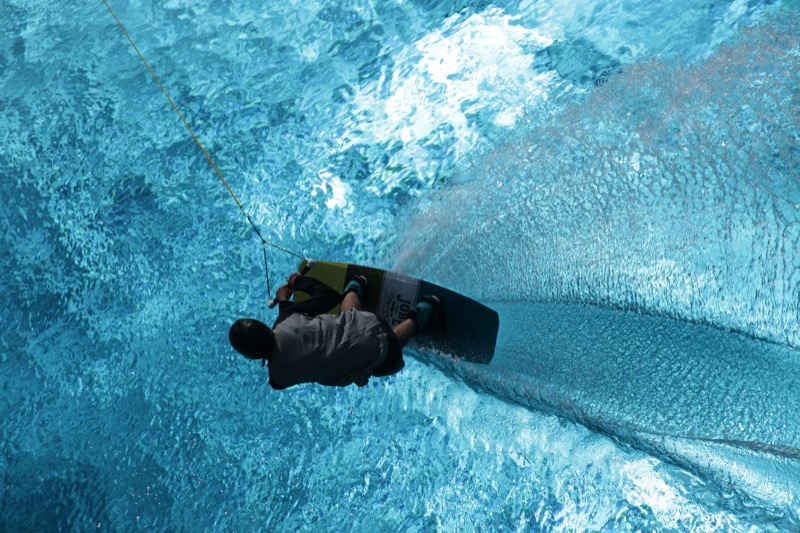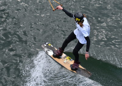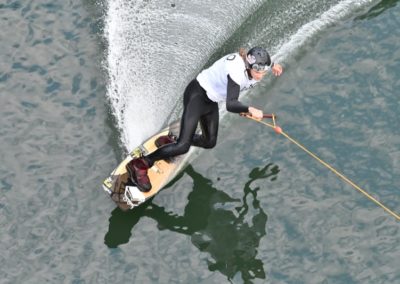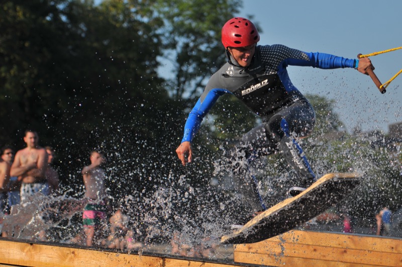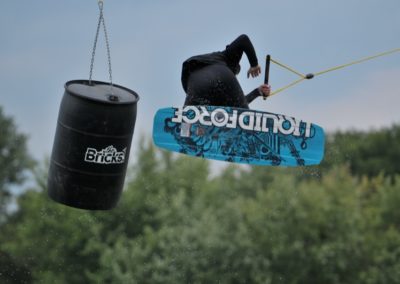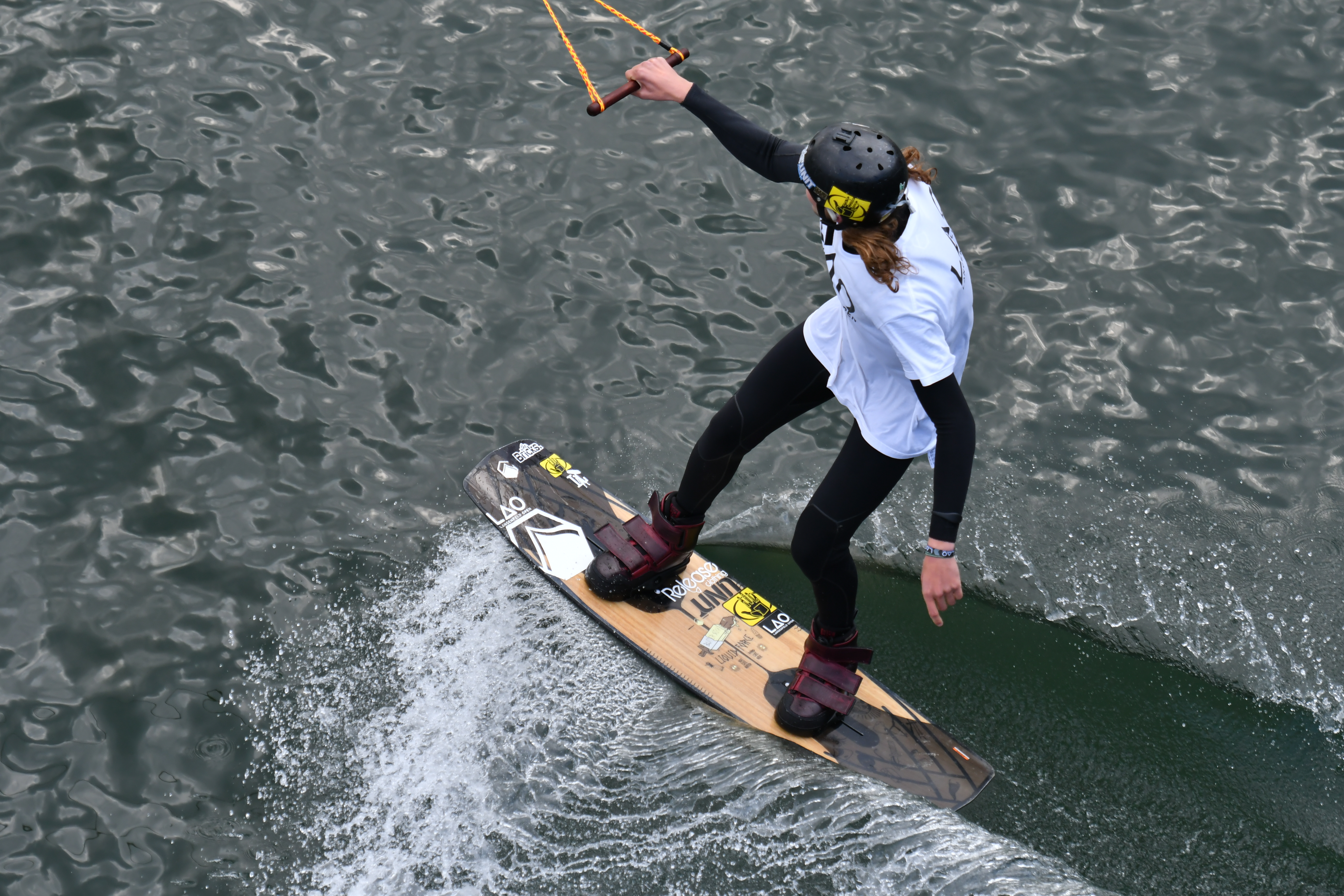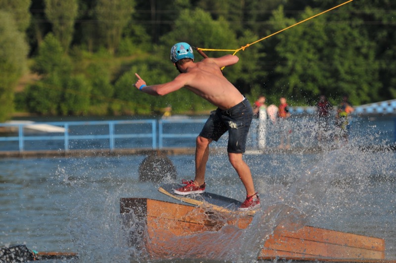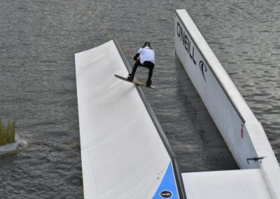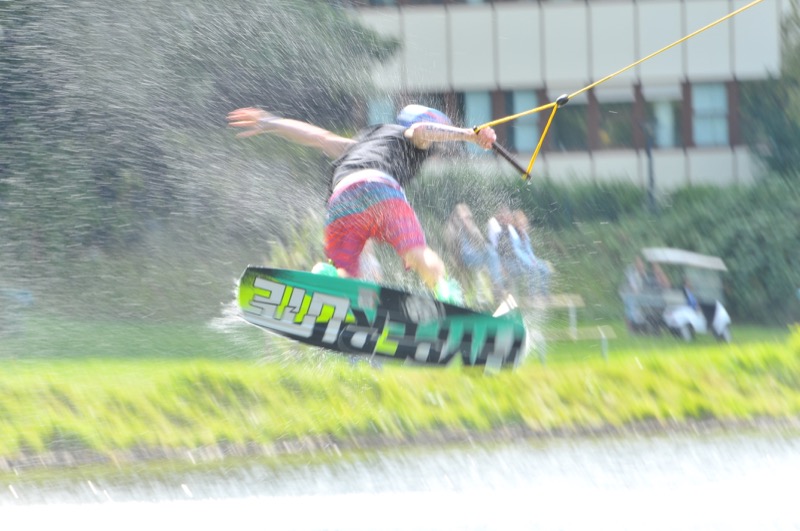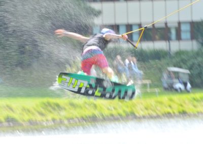 "Wakeboard (= Wasserskifahren mit Hindernissen/Obstacles) und Wakeskate (ohne Bindung)"Wassersportfotos