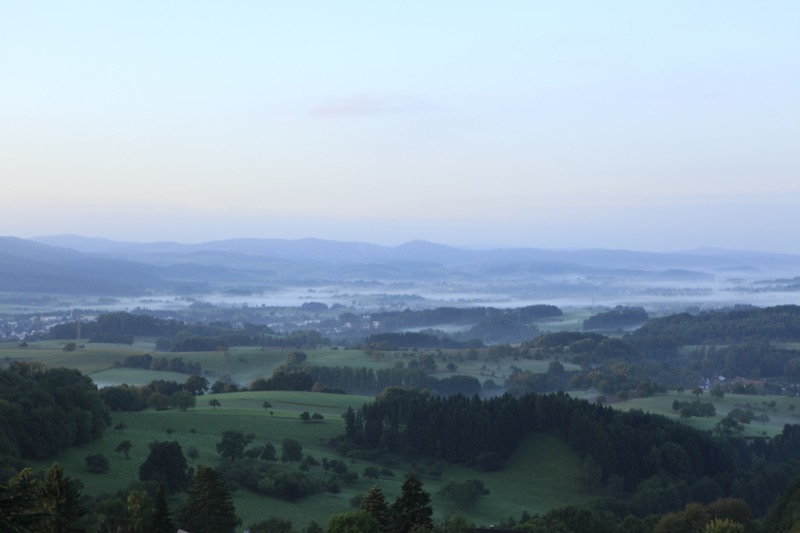 Obwohl durch rüde Bedingungen vor einigen Wochen auf der Nordschleife des Nürburgringes bereits an nächtliche Wettereskapaden gewöhnt, ist das hier nochmals eine andere Hausnummer. Volle Konzentration ist absolut erforderlich, andernfalls würde jeder Fahrfehler den Übergang ins Jenseits beschleunigen. Zweimal verliere ich fast die Besinnung, und das Gefühl wo ich mich befinde. Das Gefühl ist mir fremd und habe es auf einem Fahrrad bisher noch nicht so erlebt. Bedingt durch die Waschküchen-Sicht und die umgebende Dunkelheit tritt phasen- weise ein leichter Schwindel auf, der offenbar daraus resultiert das der Gleichgewichtssinn in Kombination mit Augen und Hirn nicht mehr registriert, ob man noch Boden unter den Reifen hat oder schon im Schwebezustand ist. Aus Sicherheitsgründen bremse ich mehrmals komplett ab, bleibe für einen Moment stehen, um mich wieder einzunivellieren. Deshalb suche ich in 2 Fällen bewusst die Nebelschlussleuchte des vorausfahrenden Autos aus, hinter dem ich nun klebe und so einigermaßen orientiert fahren kann.