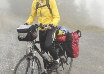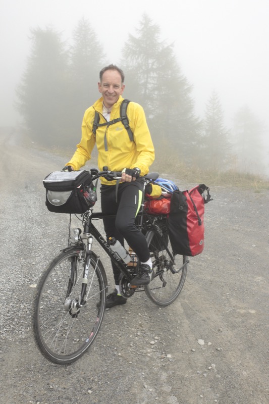 Mir steht (mit etlichen Fotostopps) eine fünfstündige Auffahrt über diverse Serpentinen bevor. Bis etwa 2000 m bleibe ich komplett von Wolken umhüllt. Mir gefällt diese mystische Stimmung ausgezeichnet und ich genieße jede Kehre. Der Wandel alpiner Klimazonen und das Durchfahren verschiedenster Vegetationsstufen muss man einfach erlebt haben. Dieser Paß ist relativ schwach befahren. St. Maria im Münstertal ist noch von Almen umgeben, sogleich beginnt der vorwiegend aus Tannen / Kiefern bestehende Bergwald. Je feuchter das Klima, umso moosiger präsentieren sich die dickrindigen Baumriesen. Erst am Rande der Baumgrenze treten Lärchen in ihrem goldenen Herbstkleid in den Vordergrund. Ab 1965 m Meereshöhe wartet eine Linie auf mich, die mein Abenteurer-Herz höher schlagen lässt (= Wechsel von Asphalt in Schotter). Es handelt sich beim Umbrail-Paß um einen der letzten Pässe mit Schotterpiste. Auf einem Abschnitt von nur 1,5 km ist er NOCH ungeteert, aber sehr gut fahrbar. Ich befinde mich ja glücklicherweise im Anstieg und nicht auf einer halsbrecherischen Abfahrt. Während der ersten Stunden begegnet mir kein einziger Radfahrer, auf der Hartschotterpiste kommen mir 3 Rennradfahrer entgegen und ein Tourenfahrer. Ihn bitte ich um ein paar Fotos, auf denen ich für die Nachwelt auch einmal zu sehen bin.
