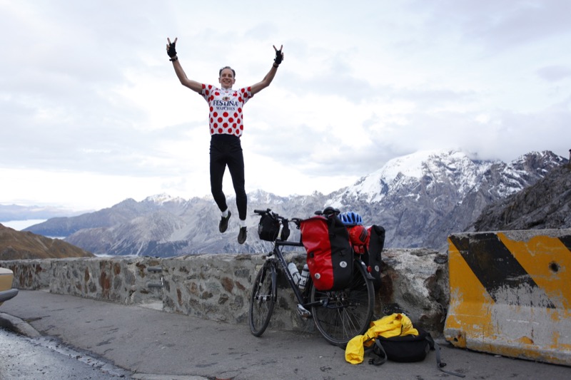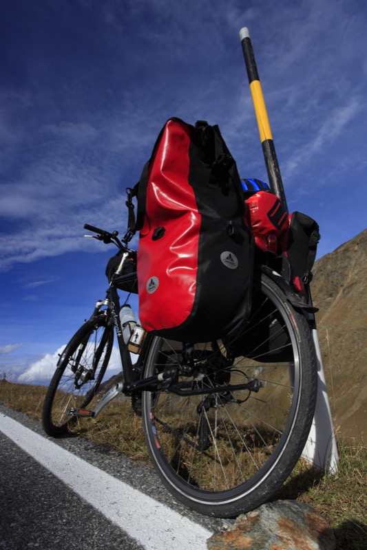 Straßenpaß. Yeah ! Das obligatorische Pässe-Foto schießt ein Düsseldorfer Tourist. Kurz vor dem Erreichen der Paßhöhe kommt mir der einzige Langstrecken-Radler entgegen. Es ist ein Japaner.