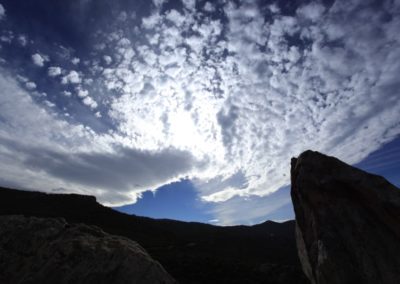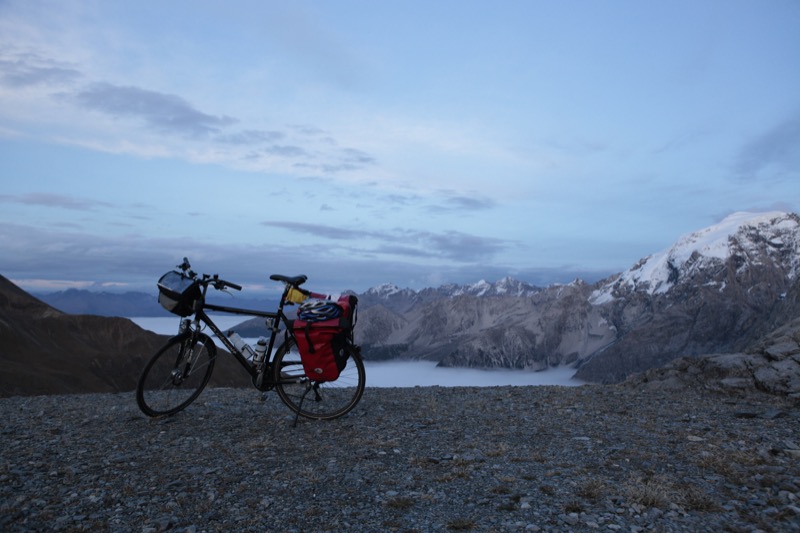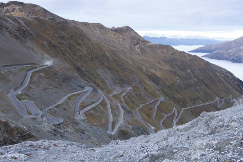 Endlich, bei etwa 2000 m reißt die bis dato undurchdringliche Wolkendecke auf und die Sonne verwandelt alles in atemberaubende alpine Schönheit. Die Tiefblicke auf eine geschlossene Wolkendecke und Ausblicke auf die letzten Kehren zur Paßhöhe sind überwältigend. Ich halte ständig, um alles fotografisch zu konservieren.