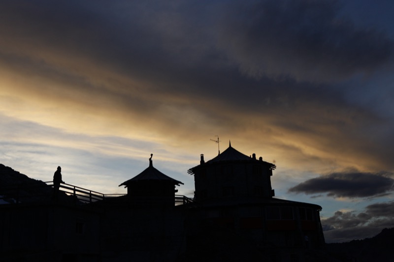 Eigentlich zweigt mein Weg hinab nach Bormio nach einigen Schwüngen unterhalb des Umbrail-Passes ab. An der Weggabelung entscheide ich mich spontan – trotz fortgeschrittener Tageszeit – dazu, noch weitere 350 m zum 3. höchsten aller Alpenpässe, dem Stilfser Joch/Passo dello Stelvio (2758 m) hinauf zu fahren. Ich bin jetzt 48 Jahre alt, habe den Pass bereits 27 Jahre zuvor gemeinsam mit Markus Wolfertz von der Nordseite über die berüchtigten 46 Kehren (damals aber bei 35-30 Grad und überwiegend schiebend) überwunden und möchte die erneute Chance nicht vertun. Um 17.45 Uhr stehe ich oben. Architektonisch eine Vollkatastrophe. Eine Bausünde grenzt an die nächste, aber der grandiose Blick auf den Ortler (3905 m) entschädigt für alle Anstrengungen. Als Souvenir erstehe ich ein Stilfser Joch T-Shirt. Das muß sein. Um einen neuen Höhenrekord aufzustellen, raffe ich mich natürlich zur Weiterfahrt zum 27 m höher gelegenen Tibethaus auf (2785 m ü. NN). In den gesamten Alpen gibt es nur noch ganz wenige anfahrbare Punkte, die noch höher liegen. Man bedenke, dass ein deutscher Watzmann bereits geringfügig unter dem jetzt erreichten Level liegt. Ich genieße die Tief- u. Rundblicke mit allen Sinnen, vergesse dabei beinahe, dass eine 25 km lange gefährliche, einsame und später dunkle Abfahrt noch bevorsteht. Die abenteuerliche Abfahrt vom Pso. dello Stelvio beginnt um 19 Uhr bei 5,8 Grad Celius. Während der ersten Minuten fahre ich noch mit guter Sicht oberhalb der Wolkendecke und in der späten Dämmerphase. Was sich dann abspielt, kommt einem fahrerischen Horrorszenario gleich. Abrupt muss ich die Geschwindigkeit drosseln, mein Rad und ich tauchen in eine einzige nebelige und dunkle Suppe ein. Der Verlauf der Straße wird immer kurviger, hin- und wieder lauern auch ein paar Abgründe. Autos fahren nur noch wenige hinab. In diesem Falle denke ich mir „leider !“, denn auch sie müssen ihr Tempo den miserablen Bedingungen anpassen. Meine Kleidung wird durch die hohe Luftfeuchtigkeit komplett nass. Die Füßlinge leisten wieder einmal gute Dienste. Meine Hochleistungsregenjacke ist Pflichtprogramm.